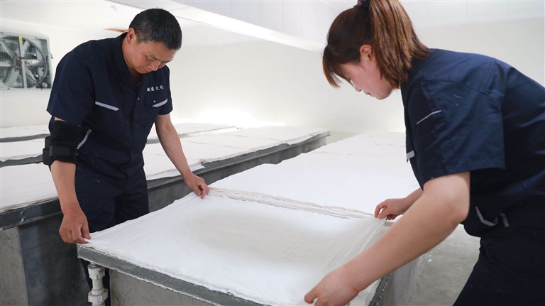 10月9日下午,縣長吳云忠赴海陽鎮(zhèn)凝霜文化發(fā)展公司調(diào)研徽州楮皮紙傳承與發(fā)展工作,縣委常委、海陽鎮(zhèn)黨委書記金學年,縣委常委、縣政府副縣長程衛(wèi)華參加調(diào)研活動。 吳云忠一行實地察看了徽州楮皮紙生產(chǎn)工藝流程,認真聽取企業(yè)負責人介紹,詳細詢問徽州楮皮紙制作工藝