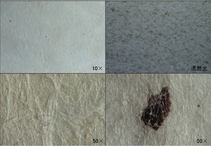 構(gòu)皮纖維雖不及麻纖維那么長,但遠長于竹纖維,一般在5-10mm 左右。由于構(gòu)皮本身具有一定的白度,纖維素含量也比較高,因此構(gòu)皮紙成紙白度一般要高于麻紙和竹紙,構(gòu)皮紙質(zhì)地較麻紙綿軟,韌性好,常被稱為“白棉紙”,亦有“蟬翼”、“冰肌”等雅喻。構(gòu)皮紙紙面的勻度和平滑度一般介于麻紙和竹紙之間,由于蒸煮過程中用到草木灰,構(gòu)皮紙一般潔白中略偏灰色,紙面纖維在光線照射下會泛出絲質(zhì)光澤。由于纖維較長不易分散,成紙內(nèi)常見有未打散的纖維束,形態(tài)蜿蜒曲折,兩端多散開呈絮狀(如圖1 左下)。構(gòu)皮紙在存放一段時間之后,紙面常見有零星的淺銹黃色暈點狀氧化斑,曾有文人墨客因此雅稱其為“桃花紙”。另外,手工抄造的構(gòu)皮紙在纖維間還常會殘留一些構(gòu)皮外皮的黑灰色碎屑,這也是構(gòu)皮紙的一個特征(如圖1 右下)。