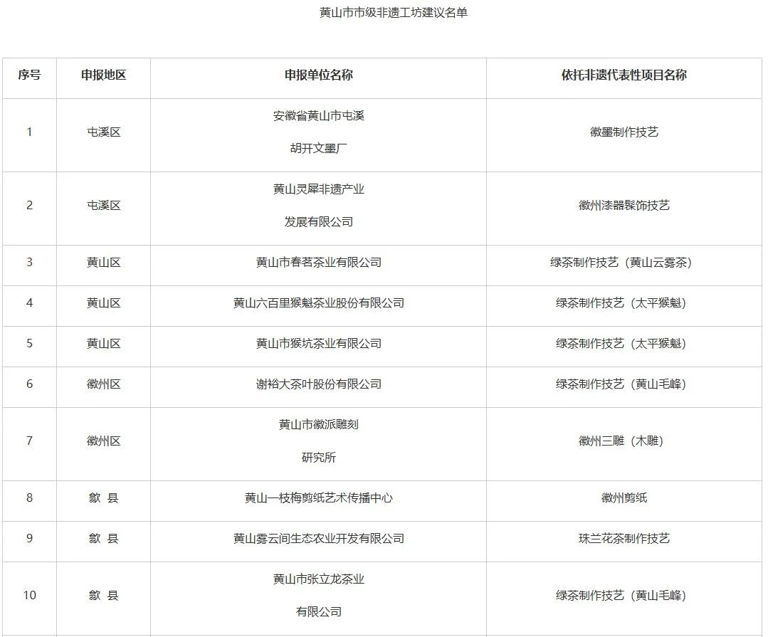 根據(jù)《安徽省文化和旅游廳安徽省人力資源和社會(huì)保障廳安徽省農(nóng)業(yè)農(nóng)村廳關(guān)于印發(fā)<安徽省非遺工坊管理辦法>的通知》要求,市文化和旅游局、市人力資源和社會(huì)保障局、市農(nóng)業(yè)農(nóng)村局聯(lián)合組織開展了市級(jí)非遺工坊認(rèn)定工作。經(jīng)申報(bào)主體自愿申請(qǐng)、各區(qū)縣初審?fù)扑]、市級(jí)評(píng)審復(fù)核,形成市級(jí)非遺工坊建議名單,共19家,具體名單如下所示: